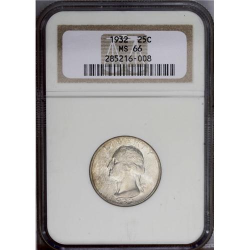 <B>1932<25C> MS66 NGC.</B></I> Tinges of gold-tan, rose, and light green visit highly lustrous surfaces that exhibit sharply struck design features. A few minute marks on Washington's cheek and neck do not detract. Census: 56 in 66, 2 finer (1/06).<BR><I>From The Houston Collection of Washington Quarters.</B></I>