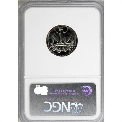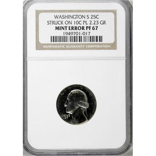 <B>Undated 25C Washington Quarter--Struck on 10 Cent Planchet--PR67 NGC.</B></I> 2.23 gm. An exceptional error from the San Francisco Mint, the S-mintmark visible but the date absent. Errors from proof coinage production are highly desirable and seldom seen. Fully mirrored nickel-gray surfaces are present on both sides, with light cameo contrast. Traces of the copper core of this clad planchet can be seen at the upper reverse.<BR><BR><B>Coin Engraver:</B> John Flanagan<BR><BR><b>Shipping:</b> Coins & Currency (<a target="_blank" href="http://www.heritageauctions.com/common/shipping.php">view shipping information</a>)