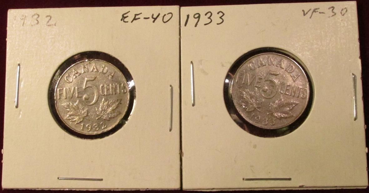 1932 & 33 Canada Nickels. VF-EF. Catalog Value $35.00.