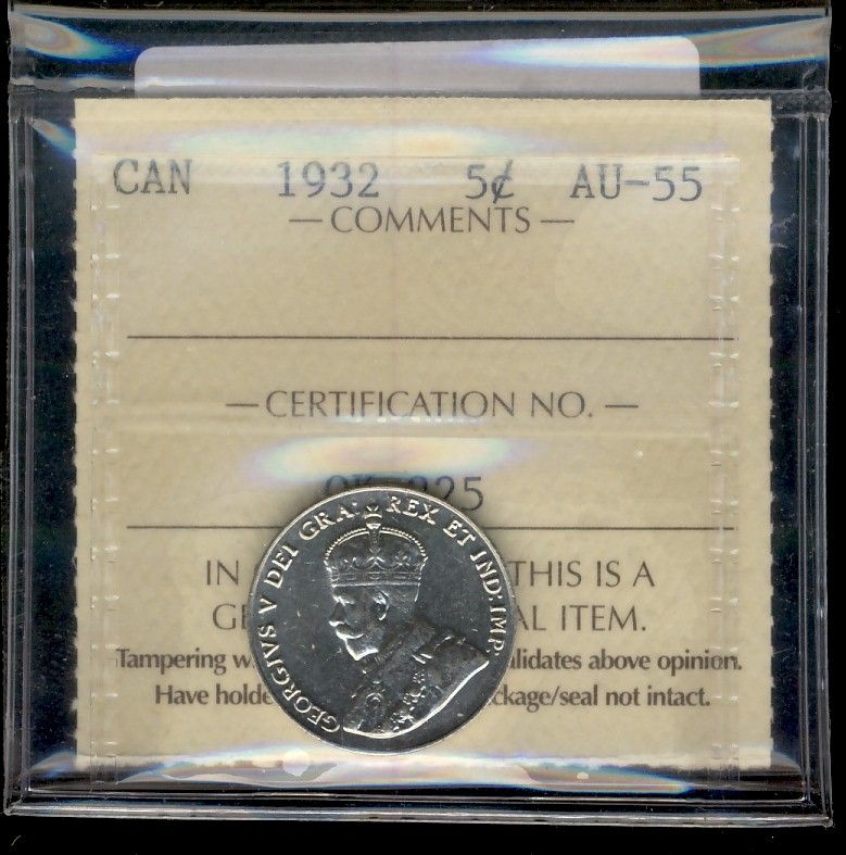1932 5¢ ICCS AU55. Full beads with MS lustre.