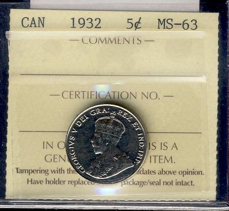 1932 5¢ ICCS MS63. A popular date and tough coin for grade.
