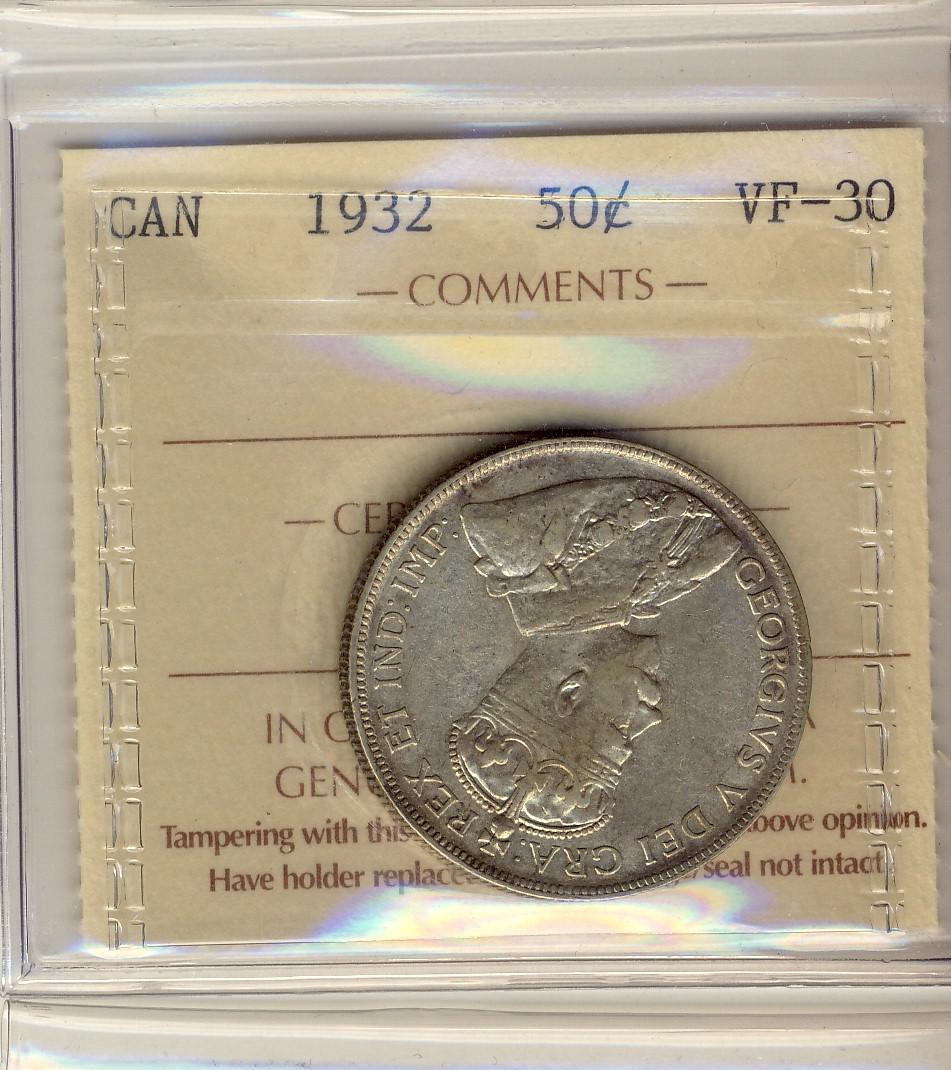 1932 50¢ ICCS VF30. Light remaining lustre