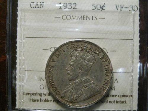 1932 50¢ ICCS VF30, a nice key date example with light brown tone.