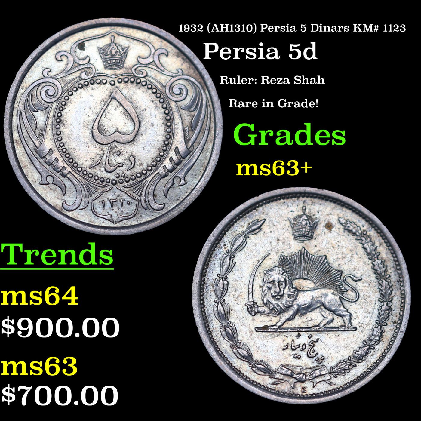 1932 (AH1310) Persia 5 Dinars KM# 1123 Grades Select+ Unc. A Corey's Pick, Bid to Win Coin