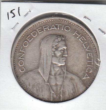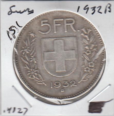 1932-B 5 SILVER FRANCS SWISS .4127 PURE SILVER