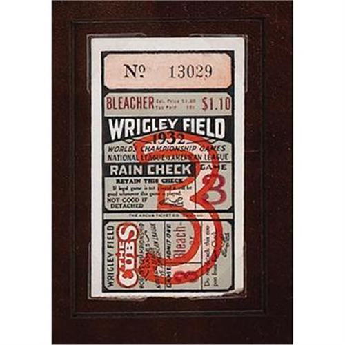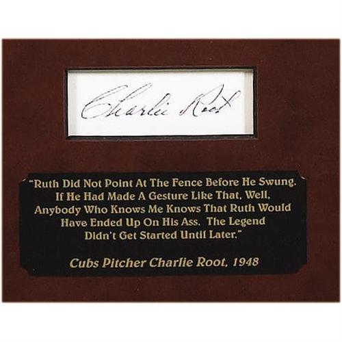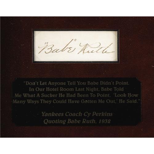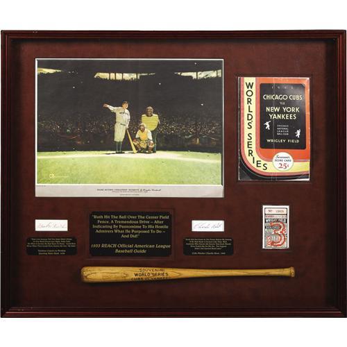 <B>1932 Babe Ruth "Called Shot" Signed Display.</B></I> For the most discerning of collectors, we present this elegantly rendered display piece memorializing the apocryphal story of the great Bambino's most celebrated at-bat. Anchoring the piece are 10/10 ink autographs on white paper from the primary players in this singular moment in baseball history, each matted in the sumptuous real leather backing along with engraved plaques that tell their conflicting tales of the event. "Anybody who knows me knows that Ruth would have ended up on his ass" reads part of Chicago Cubs pitcher Charlie Root's refutation of the legend. Joining the signatures of Ruth and Root are three pieces deriving directly from that famous Series, including a ticket stub for that historic Game Three (NRMT), a Wrigley Field program for the Series (VG) and a souvenir miniature bat sold at the park (VG-EX). Adding a final touch of visual appeal is an image of the famous painting of the event that appeared in Esquire Magazine in 1945. A third engraved plaque below tells the tale of the event as it read in the 1933 Reach Official American League Baseball Guide. The simply gorgeous shadow box display measures 25x29x2". <I>LOA from James Spence Authentication.</B></I><BR><BR><b>Shipping:</b> Framed - with Glass, Medium (<a target="_blank" href="http://www.heritageauctions.com/common/shipping.php">view shipping information</a>)