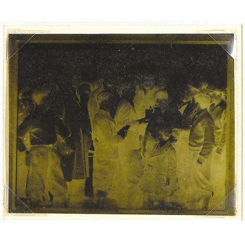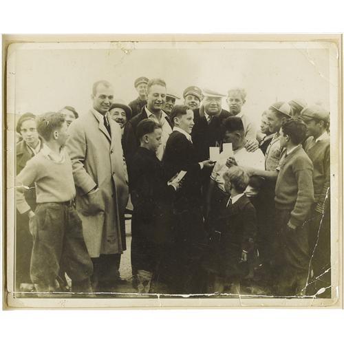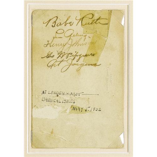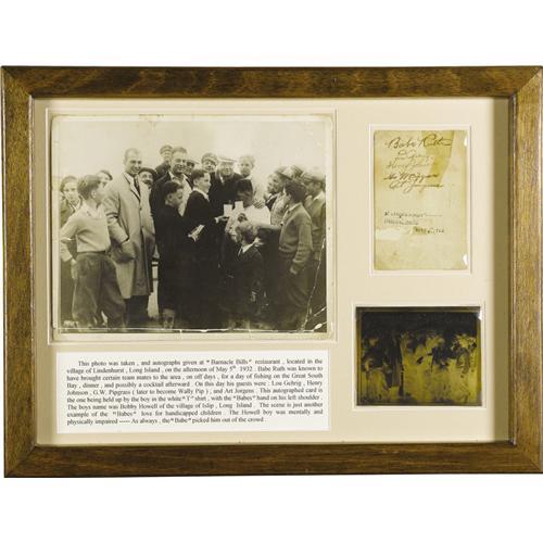 <B>1932 Babe Ruth & Lou Gehrig Signed Sheet with Photo Documentation.</B></I> The Babe's generosity to children is almost as legendary as his exploits with a Hillerich & Bradsby in his hands, and here yet again we see definitive proof of the former. The vintage 8x10" photograph of Ruth and some of his Yankee pals outside a Long Island restaurant pictures a smiling Sultan surrounded by adoring young fans. The Babe's left hand rests upon the shoulder of a husky young lad in a white shirt who holds a slip of white paper in his own left hand. We present that very piece here, a 3.5x5" page signed by (from top to bottom) Babe Ruth, Lou Gehrig, Henry Johnson, Geo. W. Pipgras and Art Jorgens. A vintage notation in another hand at bottom notes the place and date: "At Lindenhurst, Barnical (sic) Bills, May 5, 1932." The photograph shows significant creasing near the borders, but the image area remains free of distractions. The signed sheet reveals vintage tape repair that encounters the autographs of all but Gehrig, though does not derail the tremendous desirability. The signatures rate a consistent 8/10 in boldness. Each piece is expertly matted and framed along with the original negative of the photo that pictures a happy young man with the prize of a lifetime. 14x19" framed. <I>LOA from PSA/DNA.</B></I>