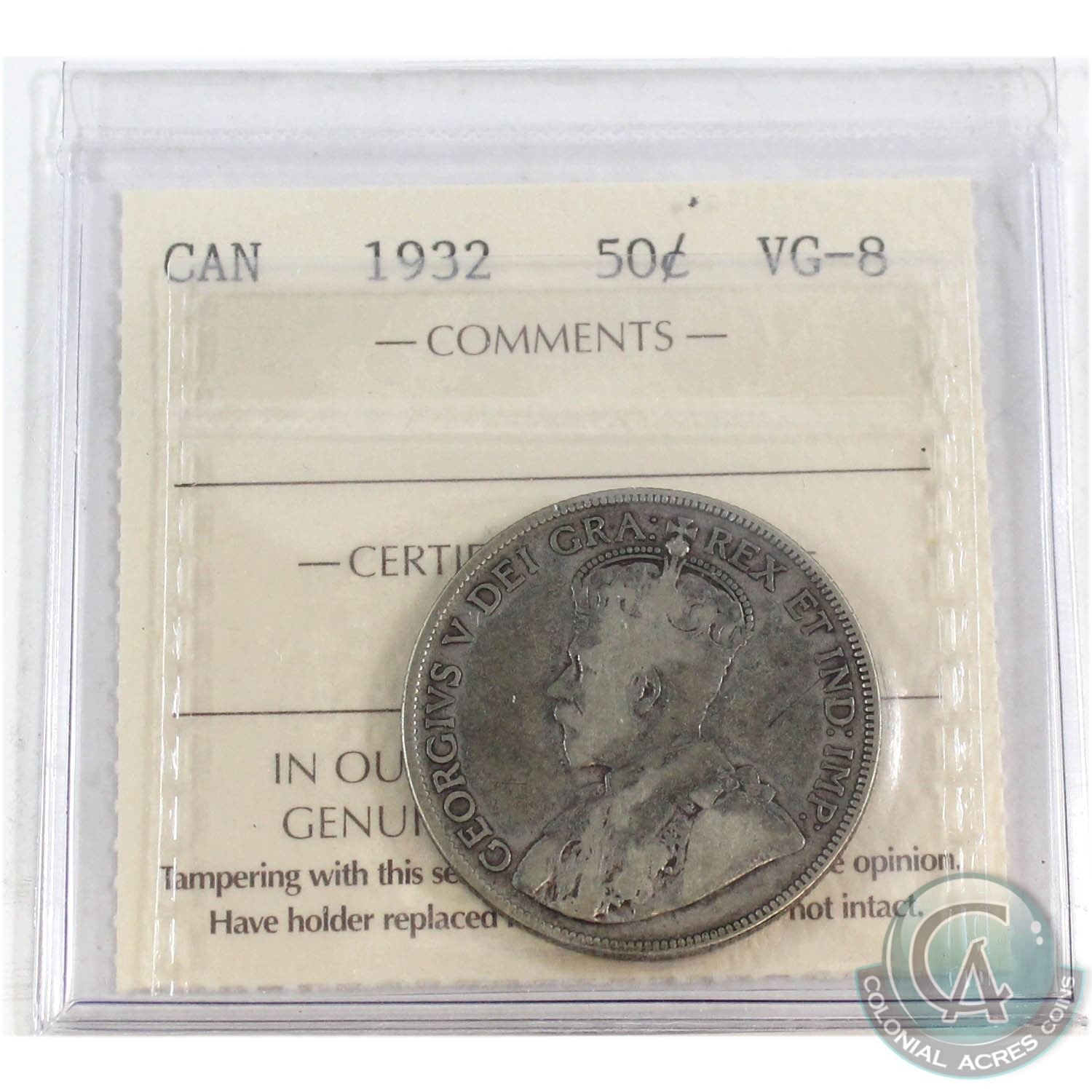 1932 Canada 50-cent ICCS Certified VG-8.