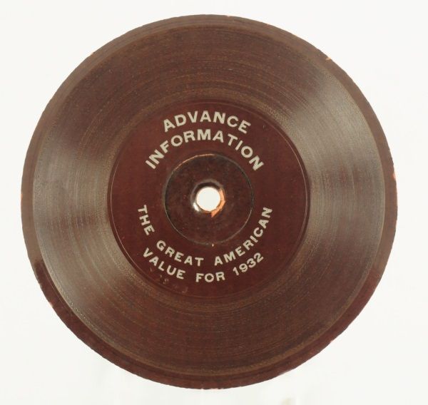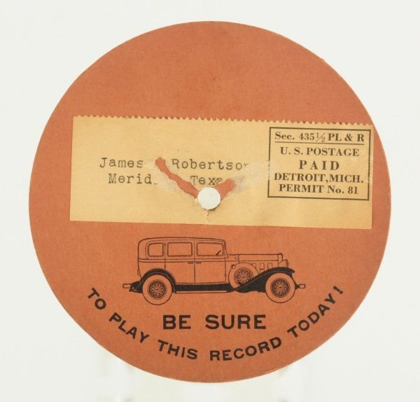 "See the U.S.A. in your Chevrolet" sung by Dinah Shore. Record measures 4" diameter. Records were mailed out to be played on your record player at home. Still has original shipping label as sent to James Robertson in Merid Texas in 1932.