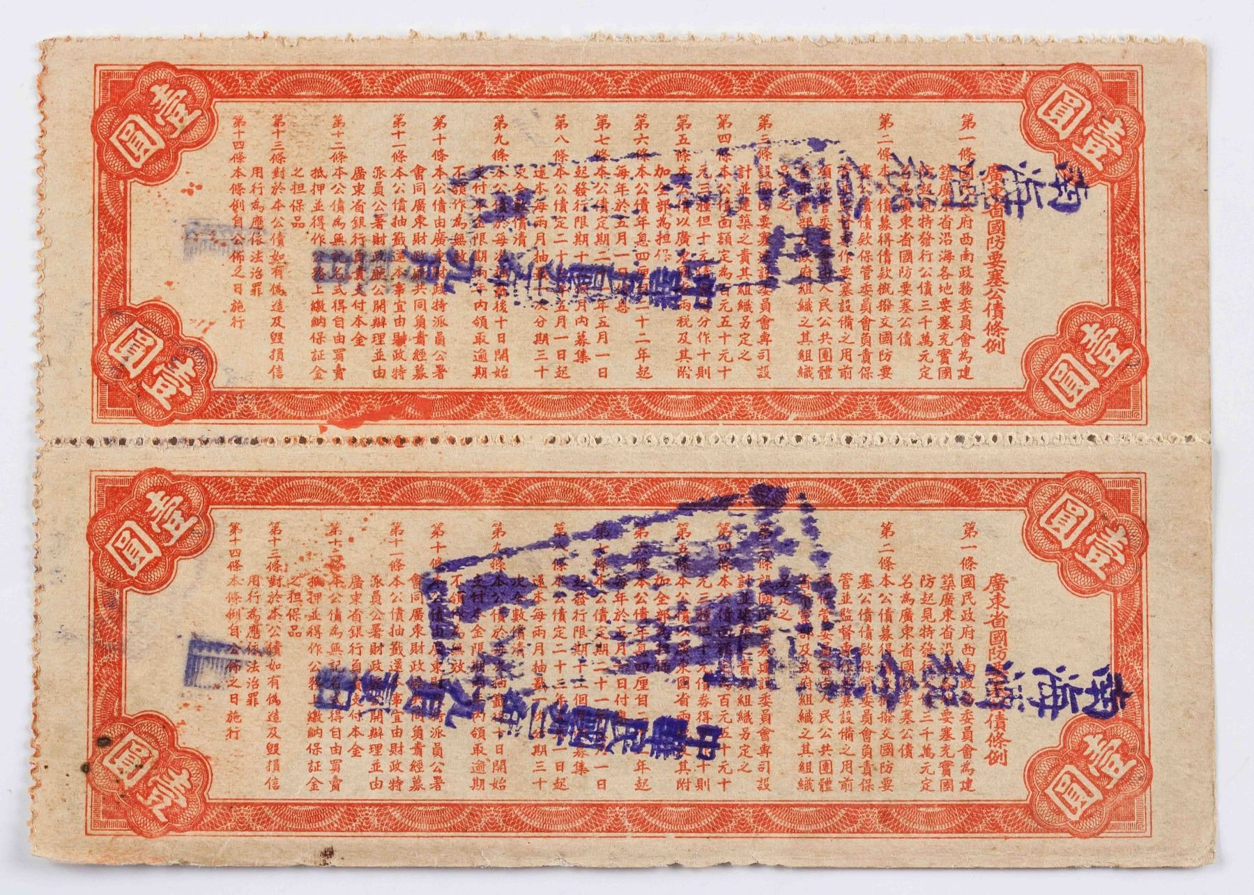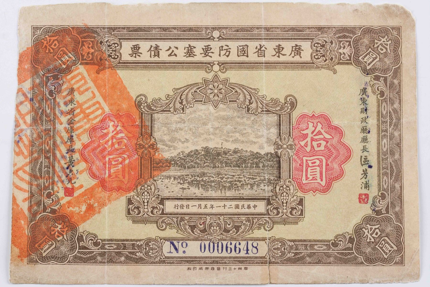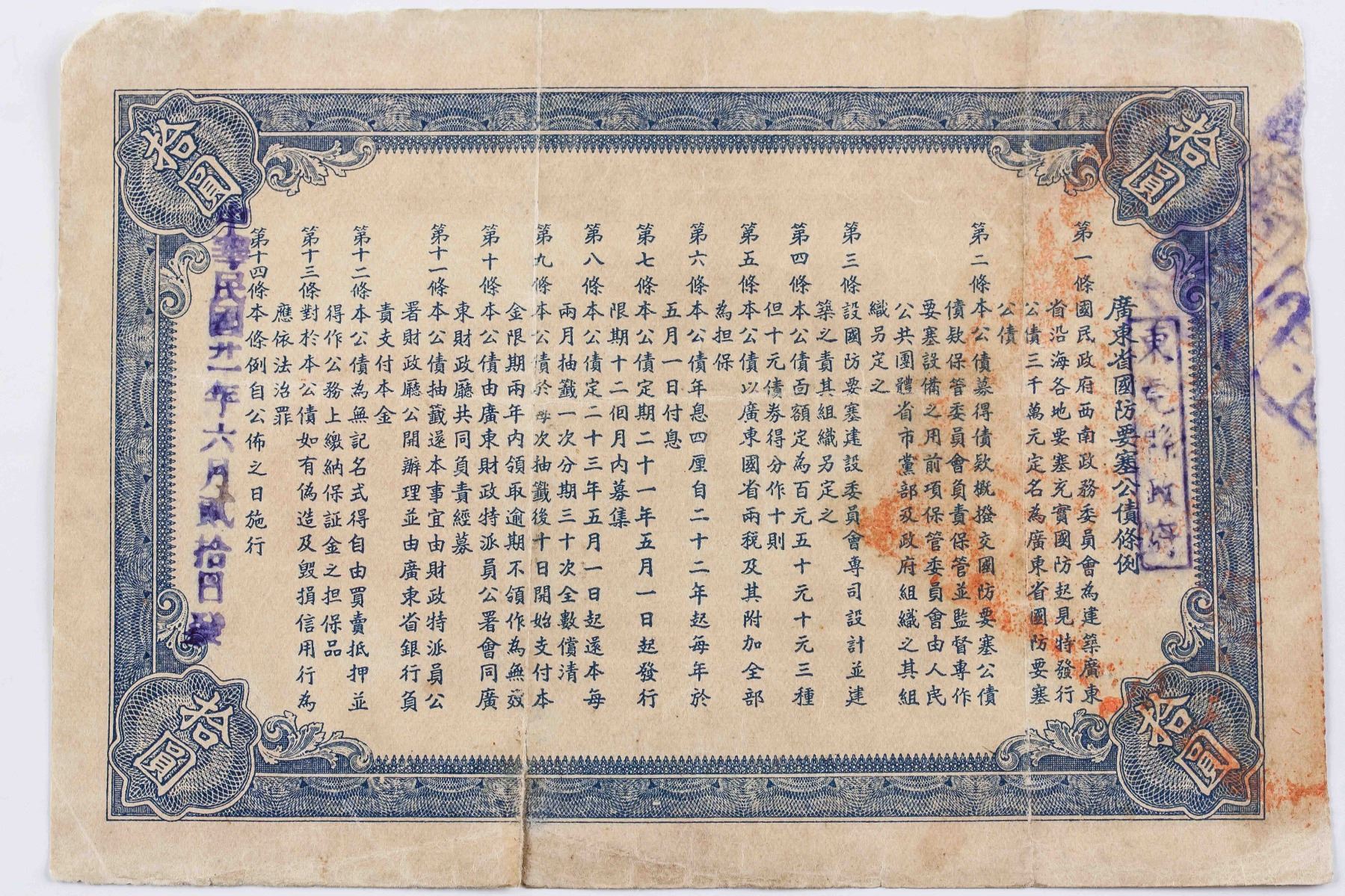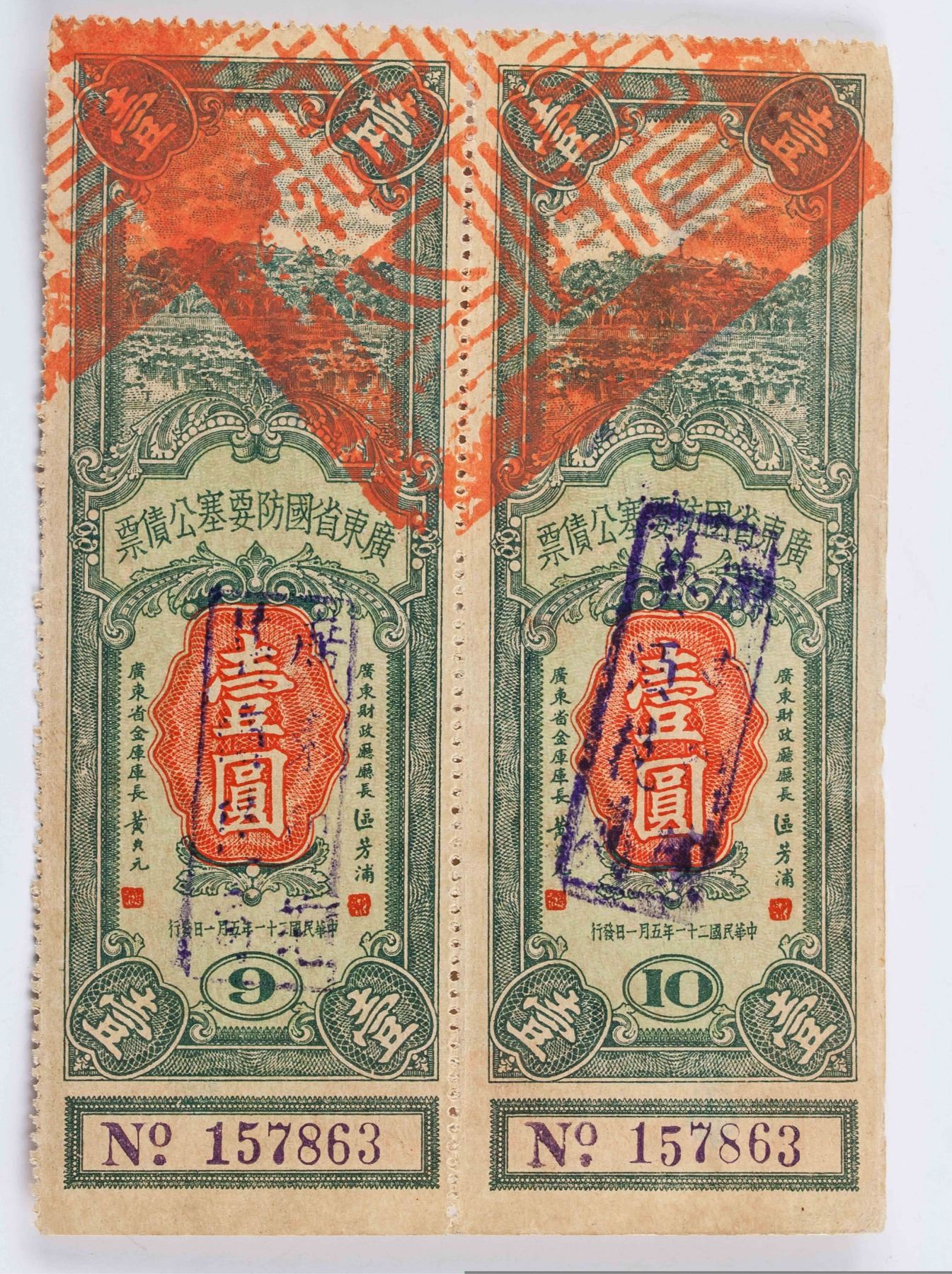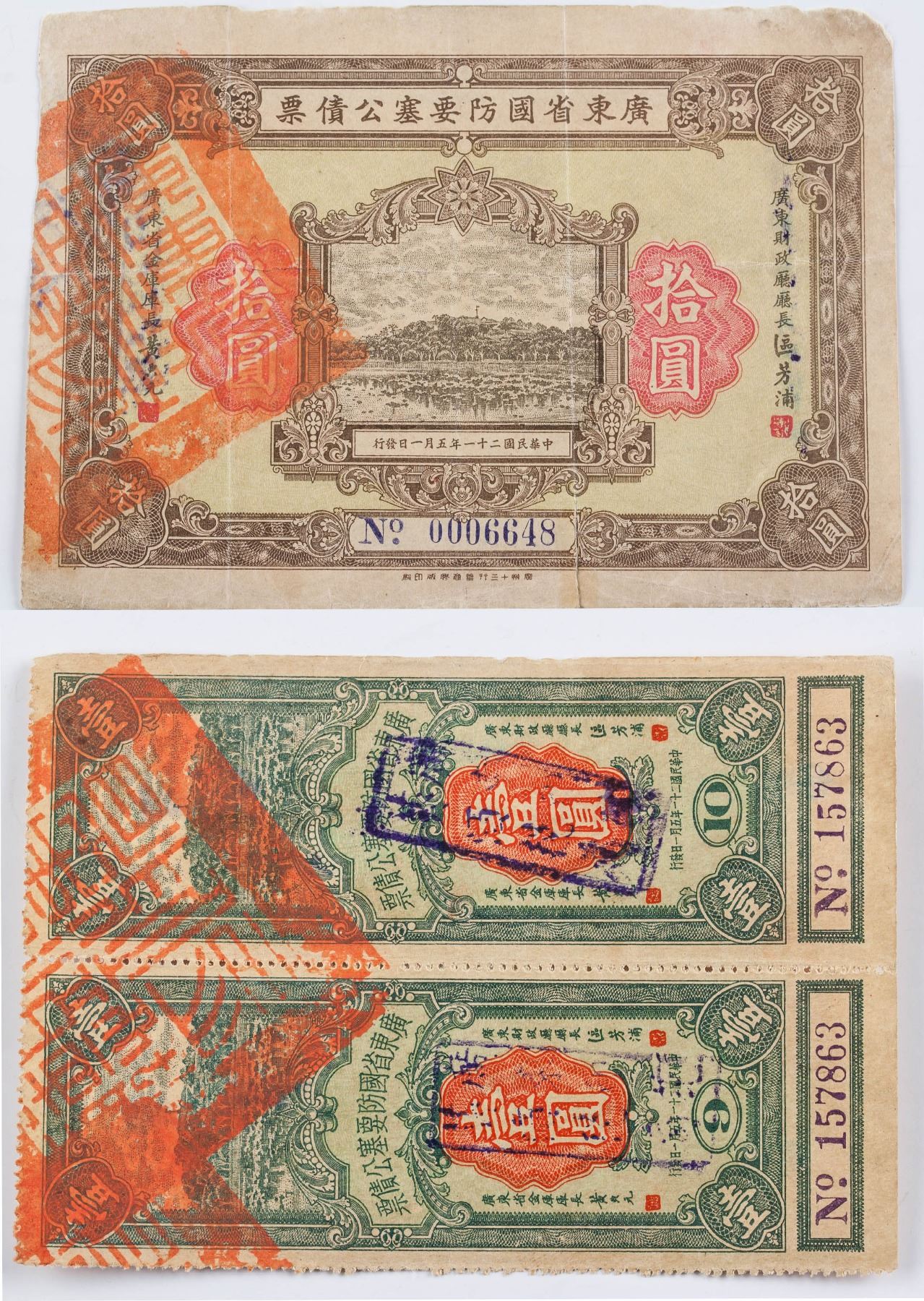 3 1932 China Republic government debt notes, of 1 10 Dollar and 2 1 Dollar, Guangdong Province, 10.8 x 15.5 cm - 9.5 x 13.3 cm