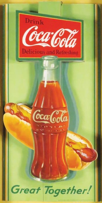 1932 Coca Cola Cardboard Cut Out Bottle Sign. Entitled "Great Together". Excellent condition. Framed under glass. 10 X 20 inches 3-D.