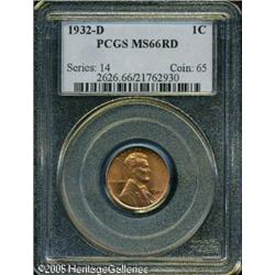<B>1932-D 1C MS66 Red PCGS.</B></I> Coppery-orange patina overlays lustrous surfaces that are devoid of any mentionable marks. The design features are well struck up throughout. Lot:5528