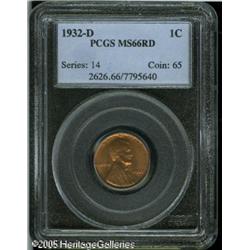 <B>1932-D 1C MS66 Red PCGS.</B></I> Pretty coppery-orange patina bathes lustrous surfaces. Nicely struck, with no significant marks. Lot:5529