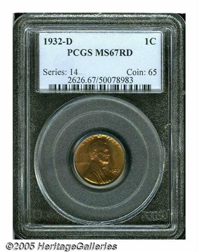 <B>1932-D<1C> MS67 Red PCGS.</B></I> Extremely lustrous with peerless fields and delicate steel-blue accents. Struck from a relatively modest mintage of 10.5 million pieces, the 1932-D Lincoln was saved in sufficient quantities to be affordable for most collectors in the lower reaches of Mint State. Once the MS67 Red threshold is reached, however, the vast majority of Uncirculated survivors have fallen by the wayside. Population: 4 in 67, 0 finer (6/05).<BR><I>From The William Bickel Collection, Part One.</B></I>