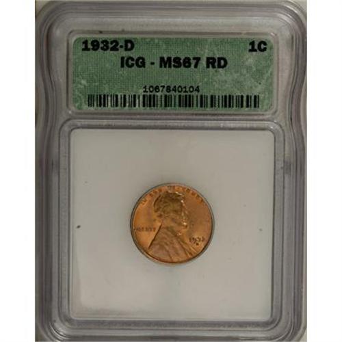 <B>1932-D 1C MS67 Red ICG.</B></I> . NGC Census: (13/0). PCGS Population (6/0). Mintage: 10,500,000. (#2626)<BR><BR><B>Coin Engraver:</B> Victor D. Brenner<BR><BR><b>Shipping:</b> Coins & Currency (<a target="_blank" href="http://www.heritageauctions.com/common/shipping.php">view shipping information</a>)