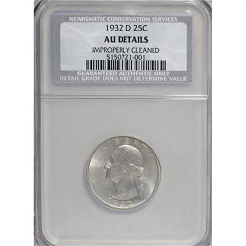 <B>1932-D 25C --Improperly Cleaned--NCS. AU Details.</B></I> NGC Census: (0/0). PCGS Population (0/0). Mintage: 436,800. (#5791)<BR><BR><B>Coin Engraver:</B> John Flanagan<BR><BR><b>Shipping:</b> Coins & Currency (<a target="_blank" href="http://www.heritageauctions.com/common/shipping.php">view shipping information</a>)