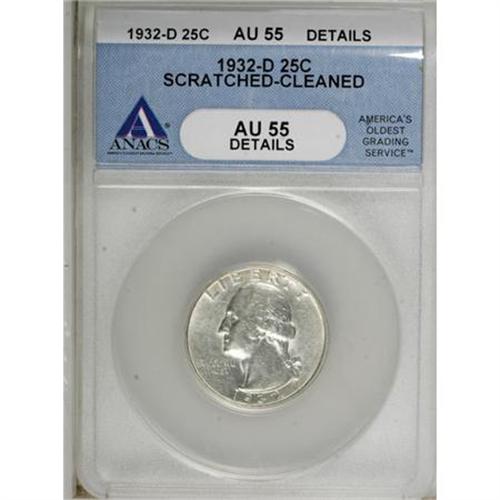 <B>1932-D 25C --Cleaned, Scratched--ANACS. AU55 Details.</B></I> NGC Census: (99/1144). PCGS Population (243/1956). Mintage: 436,800. Numismedia Wsl. Price for NGC/PCGS coin in AU55: $550. (#5791)<BR><BR><B>Coin Engraver:</B> John Flanagan<BR><BR><b>Shipping:</b> Coins & Currency (<a target="_blank" href="http://www.heritageauctions.com/common/shipping.php">view shipping information</a>)