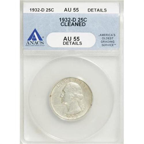 <B>1932-D 25C --Cleaned--ANACS. AU55 Details.</B></I> NGC Census: (99/1144). PCGS Population (243/1956). Mintage: 436,800. Numismedia Wsl. Price for NGC/PCGS coin in AU55: $550. (#5791)<BR><BR><B>Coin Engraver:</B> John Flanagan<BR><BR><b>Shipping:</b> Coins & Currency (<a target="_blank" href="http://www.heritageauctions.com/common/shipping.php">view shipping information</a>)