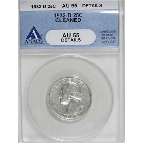<B>1932-D 25C --Cleaned--ANACS. AU55 Details.</B></I> NGC Census: (99/1144). PCGS Population (245/1963). Mintage: 436,800. Numismedia Wsl. Price for NGC/PCGS coin in AU55: $550. (#5791)<BR><BR><B>Coin Engraver:</B> John Flanagan<BR><BR><b>Shipping:</b> Coins & Currency (<a target="_blank" href="http://www.heritageauctions.com/common/shipping.php">view shipping information</a>)