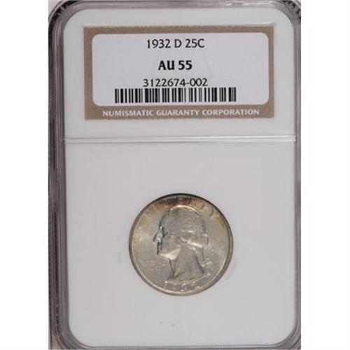 <B>1932-D 25C AU55 NGC.</B></I> NGC Census: (102/1172). PCGS Population (250/2000). Mintage: 436,800. Numismedia Wsl. Price for NGC/PCGS coin in AU55: $565. (#5791)<BR><BR><B>Coin Engraver:</B> John Flanagan<BR><BR><b>Shipping:</b> Coins & Currency (<a target="_blank" href="http://www.heritageauctions.com/common/shipping.php">view shipping information</a>)