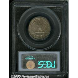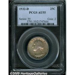 <B>1932-D 25C AU55 PCGS.</B></I> Well struck and evenly worn over the central highpoints, with lovely pink and yellow-golden iridescence highlighting the normal light-gray surface color. There are a few small contact marks and some light, scattered russet patina on the obverse as well as the reverse. Scarce key date issue.