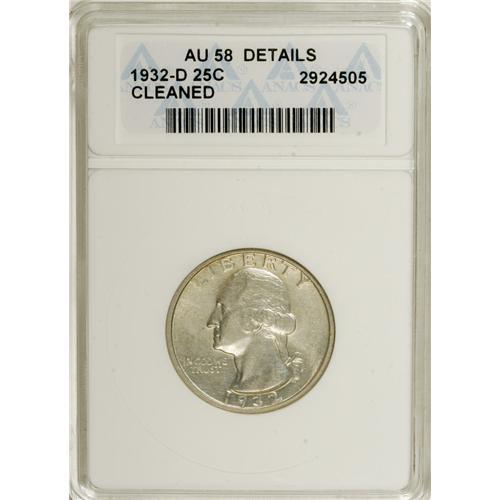<B>1932-D 25C --Cleaned--ANACS. AU58 Details.</B></I> NGC Census: (302/765). PCGS Population (421/1474). Mintage: 436,800. Numismedia Wsl. Price: $565. (#5791)<BR><BR><b>Shipping:</b> Coin/Currency (<a target="_blank" href="http://www.heritageauctions.com/common/shipping.php">view shipping information</a>)