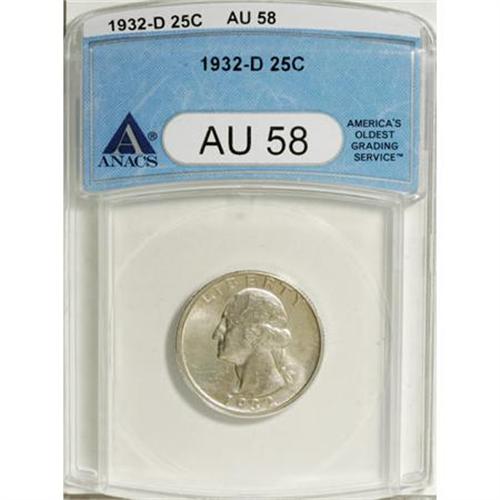 <B>1932-D 25C AU58 ANACS.</B></I> NGC Census: (316/802). PCGS Population (426/1522). Mintage: 436,800. Numismedia Wsl. Price for NGC/PCGS coin in AU58: $700. (#5791)<BR><BR><B>Coin Engraver:</B> John Flanagan<BR><BR><b>Shipping:</b> Coins & Currency (<a target="_blank" href="http://www.heritageauctions.com/common/shipping.php">view shipping information</a>)
