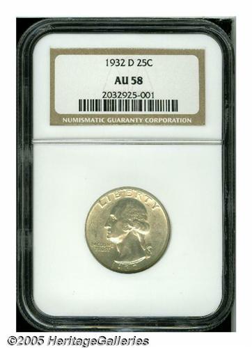 <B>1932-D<25C> AU58 NGC.</B></I> Lightly worn on the highpoints, with pleasing, trivially abraded surfaces and pale toning. A very Choice AU example of this key date.