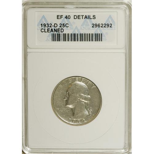 <B>1932-D 25C --Cleaned--ANACS. XF40 Details.</B></I> NGC Census: (33/1395). PCGS Population (79/2431). Mintage: 436,800. Numismedia Wsl. Price for NGC/PCGS coin in XF40: $250. (#5791)<BR><BR><b>Shipping:</b> Coins & Currency (<a target="_blank" href="http://www.heritageauctions.com/common/shipping.php">view shipping information</a>)