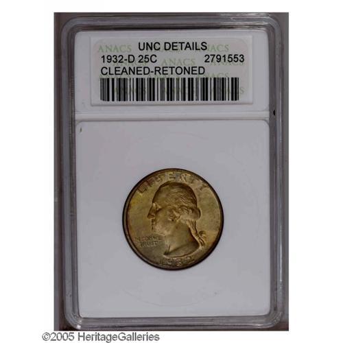 1932-D 25C --Cleaned, Retoned--ANACS. Unc. Details. 1932-D[25C]--Cleaned, Retoned--ANACS. Unc. Detai