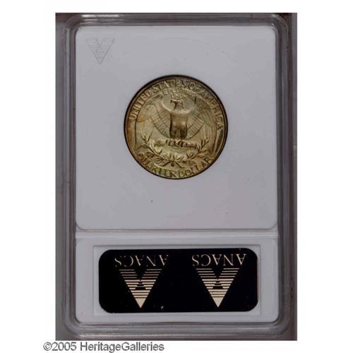 <B>1932-D<25C>--Cleaned, Retoned--ANACS. Unc. Details.</B></I> Cartwheel luster is complete beneath the rich yellow-green toning. Traces of lacquer residue are detected. Hairlines are not evident, and contact is limited to faint marks on the cheek.