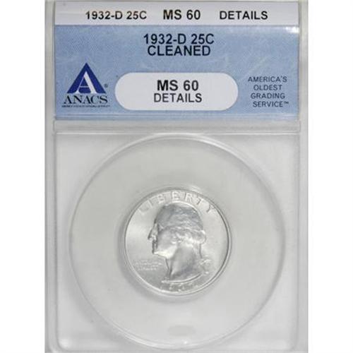 <B>1932-D 25C --Cleaned--ANACS. MS60 Details.</B></I> NGC Census: (13/815). PCGS Population (14/1529). Mintage: 436,800. Numismedia Wsl. Price for NGC/PCGS coin in MS60: $950. (#5791)<BR><BR><B>Coin Engraver:</B> John Flanagan<BR><BR><b>Shipping:</b> Coins & Currency (<a target="_blank" href="http://www.heritageauctions.com/common/shipping.php">view shipping information</a>)