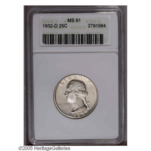 1932-D 25C MS61 ANACS. This key date Washington quarte 1932-D[25C] MS61 ANACS.