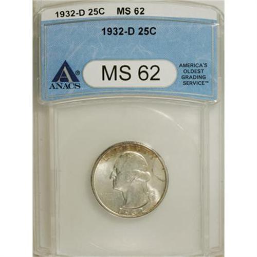 <B>1932-D 25C MS62 ANACS.</B></I> This Mint State key-date quarter has soft, pleasing luster and distinctive patina. Subtly dappled ice-blue and peach toning covers most of the obverse, while the upper rim has a crescent of orange patina and an area at the right is strikingly silver-white. The reverse is largely untoned.<BR><BR><B>Coin Engraver:</B> John Flanagan<BR><BR><b>Shipping:</b> Coins & Currency (<a target="_blank" href="http://www.heritageauctions.com/common/shipping.php">view shipping information</a>\)