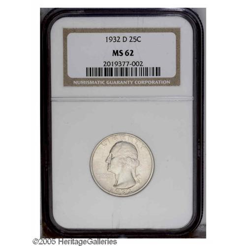 <B>1932-D<25C> MS62 NGC.</B></I> Faint rose patina. A satiny and sharply struck example that is separated from a higher grade by only a faint mark or two on the obverse. The unchallenged key date of this highly collected series.