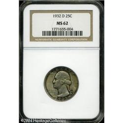 1932-D 25C MS62 NGC. This key date is dominated by <B>1932-D 25C MS62 NGC.</B></I> This key date is dominated by light golden-brown toning accented with deeper shades of russet color around the borders and fringing the design elements. Adequately struck, with no significant contact marks. <BR><BR><B>Important notice:</B> Heritage usually auctions material at the rate of 200-250 lots per hour. On some occasions eBay Live bid software or the Internet may not be able to keep up with the pace of the auction. We recommend placing a realistic absentee bid now as insurance to avoid disappointment. Occasionally the auctioneer may eliminate or reject an eBay Live bid, and the auctioneer may also reopen a lot after the close of the eBay live bidding (usually because we missed an audience bid), and may reject your bid even if it shows you as the winning bidder. By bidding via eBay Live, you agree that Heritage may award the lot to another bidder at its sole discretion under the circumstances described above or any other reasonable circumstances. Since eBay bids are not shown to us until we open the lot on the floor, we treat those bids just like floor bids. In most cases the floor responds before the eBay bid is presented to us, due to Internet lag time, so for consistency we have made it a policy that floor bids are always considered first over tie eBay live bids. Also please note that all Heritage lots purchased through eBay Live carry a 20% Buyer's Premium. Please make sure you read the Terms and Conditions before you bid. This lot is being auctioned in conjunction with a live floor auction by Heritage Galleries & Auctioneers. All final auction and invoice information will be supplied by Heritage Galleries & Auctioneers, and all other information should be considered preliminary. Lot:5975