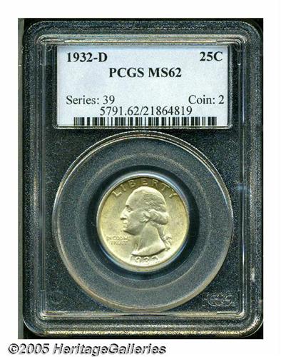 <B>1932-D<25C> MS62 PCGS.</B></I> This key date displays well defined design elements and a layer of yellow-gold patina overlying soft luster. A few minute marks are visible on Liberty's cheek and temple, and on the eagle's legs and lower right wing. This is an acceptable specimen for a lower Uncirculated set of Washington quarters.