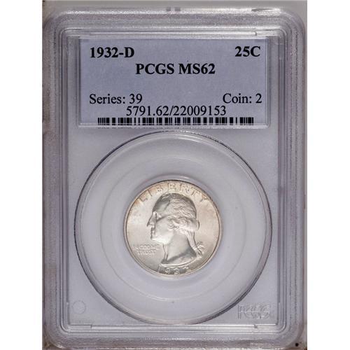 <B>1932-D<25C> MS62 PCGS.</B></I> This lightly toned and typically marked key date quarter has a tiny spot between the RT in LIBERTY. Considered tougher in Mint State than the 1932-S, despite the slightly lower mintage of the latter.
