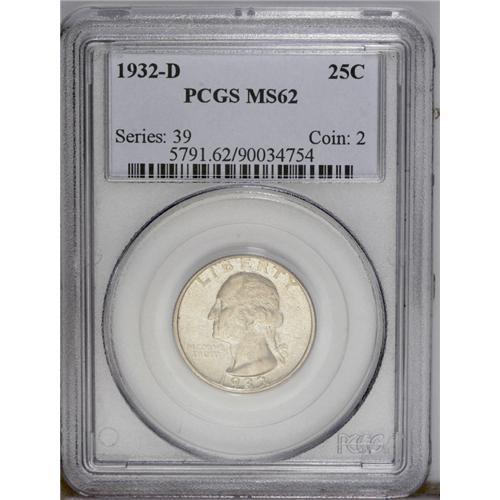 <B>1932-D<25C> MS62 PCGS.</B></I> Well struck with decent breast feathers and light golden toning. Minor abrasions on Washington's face and the eagle's breast define the grade on this scarce, first-year issue.<BR><I>From The Steve Glenn Collection.</B></I>