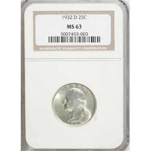 <B>1932-D 25C MS63 NGC. CAC.</B></I> This frosty key-date representative exhibits sharply struck design elements and is devoid of toning. A few minor ticks scattered about preclude a higher grade, still a super-looking coin for the "Select" level of preservation. This piece will fit comfortably in a Mint State Washington quarter collection.<BR><I>From The Hoffy Collection, NGC's #3 Registry Collection of Standing Liberty Quarters.</B></I><BR><BR><B>Coin Engraver:</B> John Flanagan<BR><BR><b>Shipping:</b> Coins & Currency (<a target="_blank" href="http://www.heritageauctions.com/common/shipping.php">view shipping information</a>)