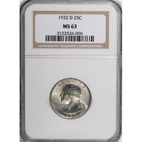 <B>1932-D 25C MS63 NGC.</B></I> Well preserved and highly lustrous, this key date quarter may be conservatively graded at the Select Mint State grade level. Boldly struck and untoned, except for faint peripheral coloration, with very few marks on either side. Only 436,800 pieces were struck, ensuring the perennial popularity of this rare issue. <BR><BR><B>Coin Engraver:</B> John Flanagan<BR><BR><b>Shipping:</b> Coins & Currency (<a target="_blank" href="http://www.heritageauctions.com/common/shipping.php">view shipping information</a>)
