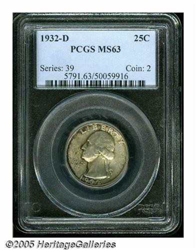 <B>1932-D<25C> MS63 PCGS.</B></I> Deep cordovan-brown toning is seen, particularly in the crevices over each side. Several noticeable abrasions have collected on the obverse, these being the grade-limiting factors. Popular key date issue.