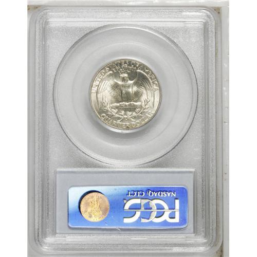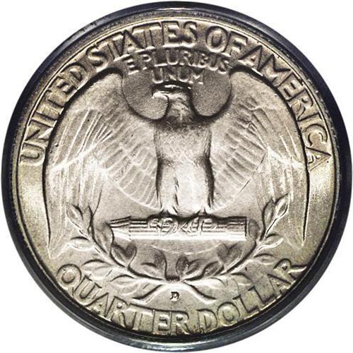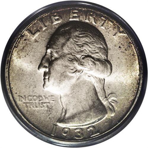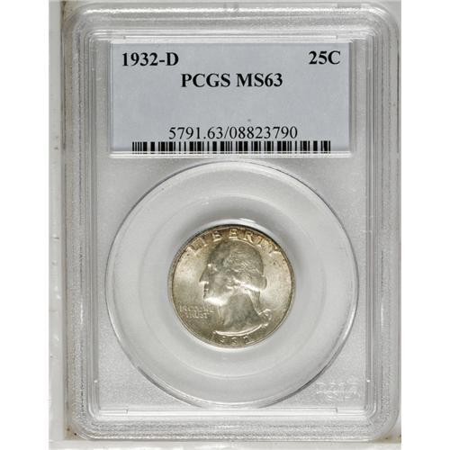 <B>1932-D<25C> MS63 PCGS.</B></I> Golden-rose and aquamarine toning adorn the upper obverse margin, but this lustrous key date quarter is otherwise nearly brilliant. The strike is assertive, and neither fields nor devices exhibit remotely mentionable marks. The premium of the 1932-D over its 1932-S key date competitor increases in higher grades.