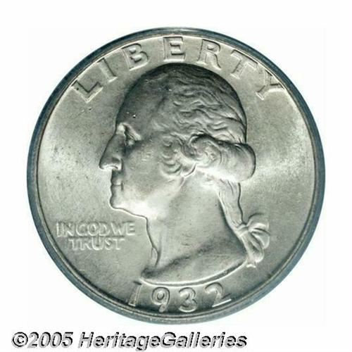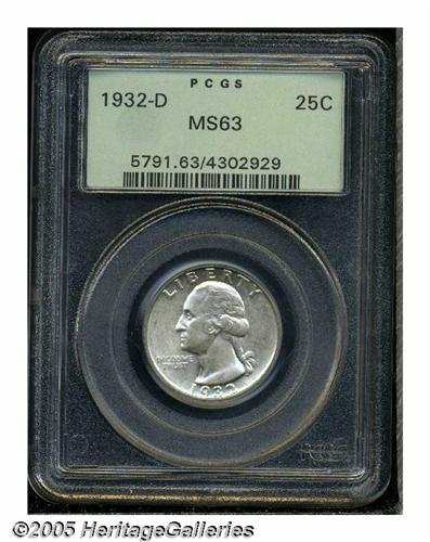 <B>1932-D<25C> MS63 PCGS.</B></I> Select quality for this desirable first-year key, being well detailed with blushes of milky patina across the obverse. A few pinpoint abrasions on and to the left of Washington's portrait limit the grade.