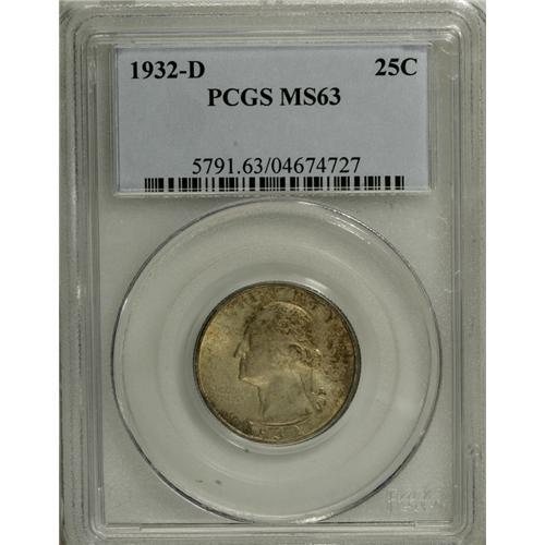 <B>1932-D 25C MS63 PCGS.</B></I> The mintmark is clearly repunched. This first-year issue is popular among collectors because of its low original mintage of only 436,800 pieces. This Select example displays satin luster and attractive speckled toning near the periphery on both sides. A minimal number of trivial marks are noted, for the grade.<BR><BR><b>Shipping:</b> Coins & Currency (<a target="_blank" href="http://www.heritageauctions.com/common/shipping.php">view shipping information</a>)