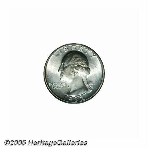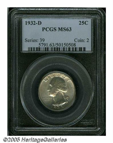 <B>1932-D<25C> MS63 PCGS.</B></I> This key date representative displays lustrous surfaces overlain with a fine veneer of pastel sky-blue and rose-tan patina, and the design elements are sharply impressed. Some grade-limiting marks are noted on Washington's cheek and neck. The continuing Statehood Quarter series continues to bring collectors to the earlier Washington type, and the demand for quality Mint State examples of the key 1932-D is much greater than the meager supply.