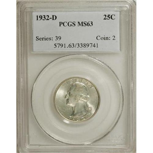 <B>1932-D 25C MS63 PCGS.</B></I> A silver-white example of this key issue, with touches of smoke-gray noted under a loupe. While a couple of contact marks, on Washington's chin and the bust truncation, preclude a finer grade, this piece has the appeal of a higher-Mint State piece and would fit well into a Gem set at a much more advantageous price.<BR><BR><B>Coin Engraver:</B> John Flanagan<BR><BR><b>Shipping:</b> Coins & Currency (<a target="_blank" href="http://www.heritageauctions.com/common/shipping.php">view shipping information</a>\)