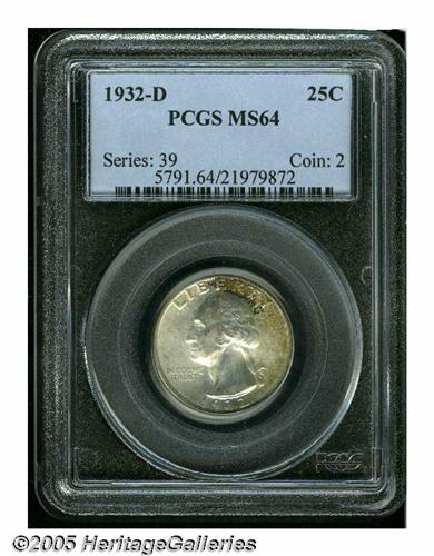 <B>1932-D<25C> MS64 PCGS.</B></I> A lightly toned near-Gem with specks of deeper russet and charcoal toning above the portrait. Just a few pinpoint marks can be detected in Washington's hair upon close inspection.