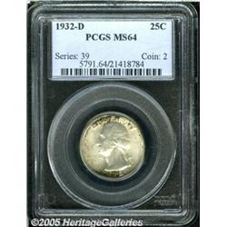 <B>1932-D 25C MS64 PCGS.</B></I> A thin coating of silver-gray patina is accented with portions of deep russet color at the top and bottom of the obverse. Well struck with a few small marks that are typical for the grade.