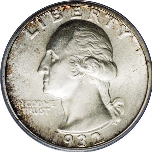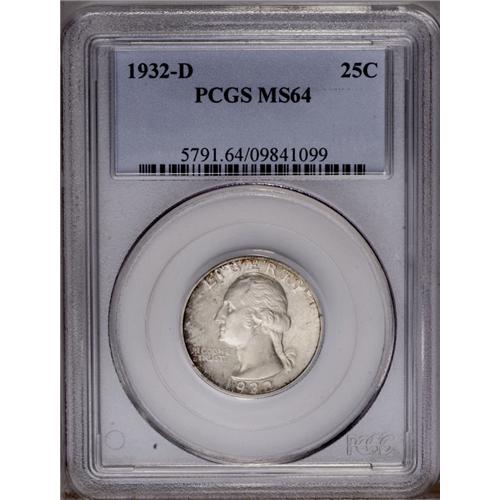 <B>1932-D<25C> MS64 PCGS.</B></I> A thin coating of silver-gray patina is accented with portions of deep russet color at selected portions of each side. Well struck with a few small marks that are typical for the grade. An ideal example of this key date issue.